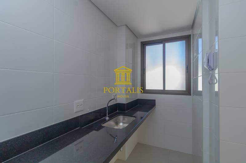 Cozinha funcional com bancada em granito, piso em porcelanato.